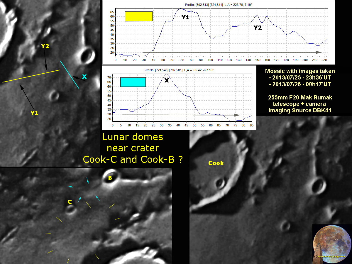 - Here a mosaic with two images of the region near crater Cook (southeast mare Nectaris) taken 2013/07/25 (23h36'UT) and 2013/07/26 (00h17'UT) from Cremona (Italy) wit 255mm f20 Mak Rumak telescope + camera Imaging Source DBK41. Are very interesting two reliefs in the area of craters CooK-C and Cook-B about their shape like lunar domes.