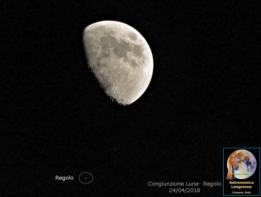 | 24/04/2018 - Congiunzione Luna Regolo - Focale di acquisizione: 914mm - F6,5 - 1/8"HDR +1/160 sec - ISO 800/400 |