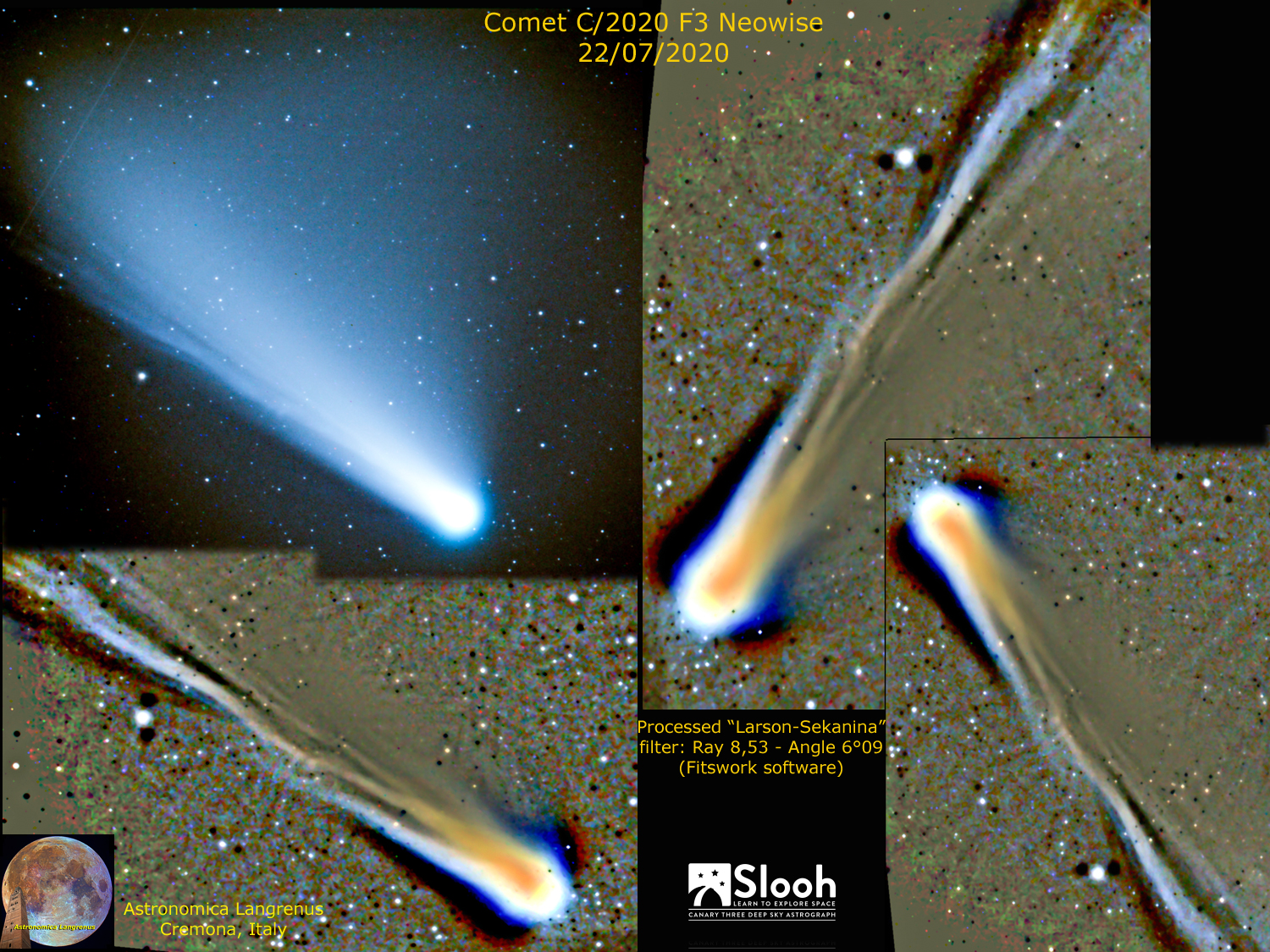 La C/2020 F3 (NEOWISE) è una cometa scoperta il 27 marzo 2020 da parte del telescopio spaziale NEOWISE. Ha raggiunto il perielio il 3 luglio e raggiungerà il suo punto più vicino alla Terra il 23 luglio 2020. Queste immagini sono state riprese con un telescopio Maksutov Rumak di 255mm di diametro con focale nativa F20 (5000mm) a cui è stato applicato un correttore-riduttore di focale portando il rapporto focale a F12,6 (3200mm). La camera CMOS utilizzata è la Zwo ASI 224MC sommando 800 su 3800 frames totali acquisiti a 30 fps in USB 2.0. Elaborazione in Autostakkert, Registax, Photoshop. Alle immagini è poi stato applicato il filtro Larson-Sekanina, utile per rilevare una accentuazione del contrasto della struttura principale della coda in uscita dal nucleo oltre alle deboli strutture a fontana dovute ad elevata attività sulla superficie del nucleo stesso (in questo caso indicate dalle frecce). Analogamente alle riprese effettuate a suo tempo sul nucleo della Hale Bopp. Per quanto riguarda la C/2020 F3 Neowise è stata posta in evidenza anche una notevole struttura spiraliforme intorno al nucleo cometario come si può notare nelle immagini seguenti.