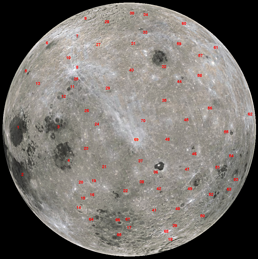 Dopo l'immagine, vedere l'elenco in cui ad ogni singolo numero corrisponde la rispettiva formazione lunare sulla mappa