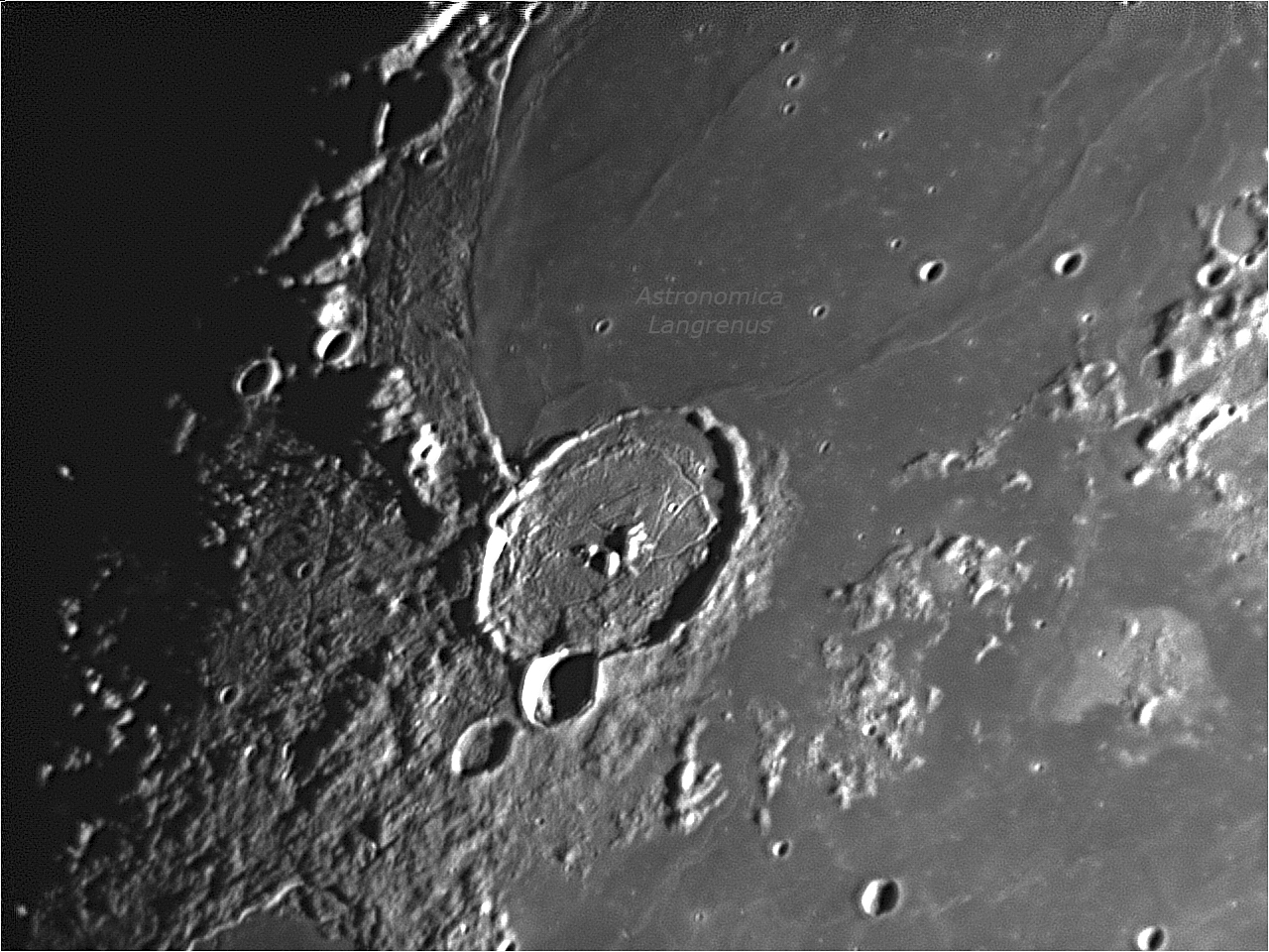 Descrizione: Il bacino circolare del mare Humorum la cui superficie è di 80.000 kmq è situato nel settore sud-occidentale della Luna. Una volta oltrepassato il margine meridionale dell'oceanus Procellarum abbiamo il cratere Gassendi, struttura crateriforme del diametro di 85 km circondata da pareti alte 3000 mt la quale domina incontrastata nel paesaggio di questa regione. La platea di Gassendi esibisce un picco centrale montuoso composto da più cime intorno alle quali si vedono alcuni solchi e rilievi collinari. Seguendo il lato occidentale del mare Humorum incontriamo Mersenius, cratere del diametro di 72 km il cui fondo è marcatamente convesso e dove in favorevoli condizioni di illuminazione solare si notano piccoli craterini. Da questo cratere parte un solco (la rima Mersenius) diretto verso nord in direzione di Letronne, posto sul lato sud dell'oceanus Procellarum. Poco più a sud ma sempre lungo il margine occidentale del mare Humorum vi è il cratere Liebig alla base del quale non si può fare a meno di notare la rupes Liebig, posta a delimitare un dislivello del suolo lunare di alcune centinaia di metri. Siamo ora in prossimità del margine meridionale del mare Humorum e nella pianura si vede Puiseux, cratere sepolto sotto lo strato di materiali che ricopre il suolo lunare. Nelle vicinanze abbiamo anche Doppelmayer la cui parete di nordovest pare sia stata parzialmente coperta di materiale lavico fuoriuscito dal sottosuolo all'epoca degli impatti meteoritici che diedero origine a queste strutture superficiali. Nella stessa area ma a breve distanza abbiamo inoltre i crateri Lee e Vitello. Sul settore sudest del mare Humorum un promontorio si inoltra nella pianura, è il Cape Kelvin. A breve distanza vi è il cratere Hippalus, mentre tutta la vasta regione posta ad oriente di questo bacino circolare è percorsa da tre solchi paralleli per una lunghezza di circa 250 km: si tratta della rima Hippalus. Nella distesa del mare Humorum si possono osservare numerosi crateri di piccolo diametro. Il mare Humorum confina a nord con l'oceanus Procellarum mentre ad est, una volta attraversata la rima Hippalus, ci si avvicina al margine occidentale del mare Nubium. Una regione marginale situata a sudest è la palus Epidemiarum, relativamente pianeggiante e di 30.000 kmq di superficie.